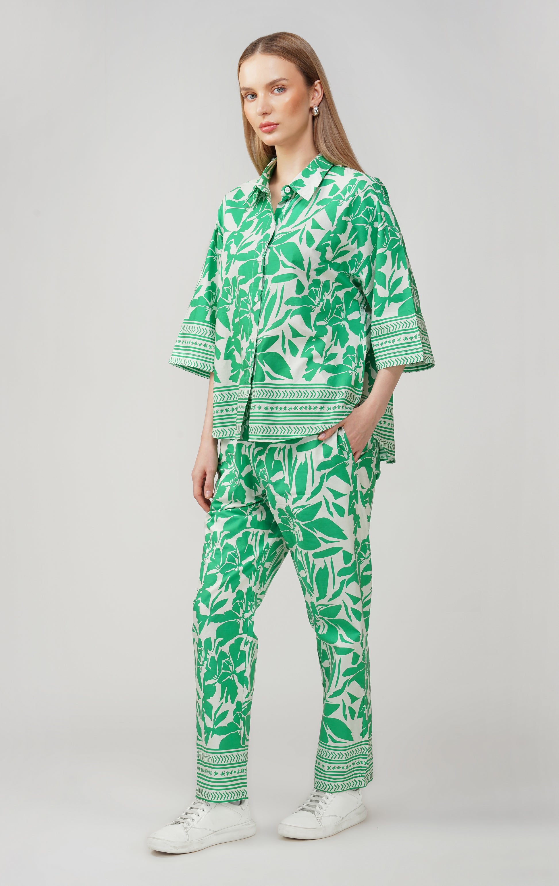 Crafted in 100% breathable cotton, this set features a refreshing green botanical print with intricate border detailing, making it versatile for brunches, holidays, or cozy evenings at home. The relaxed-fit button-down shirt pairs with straight pants, giving you a look that’s both playful and premium.