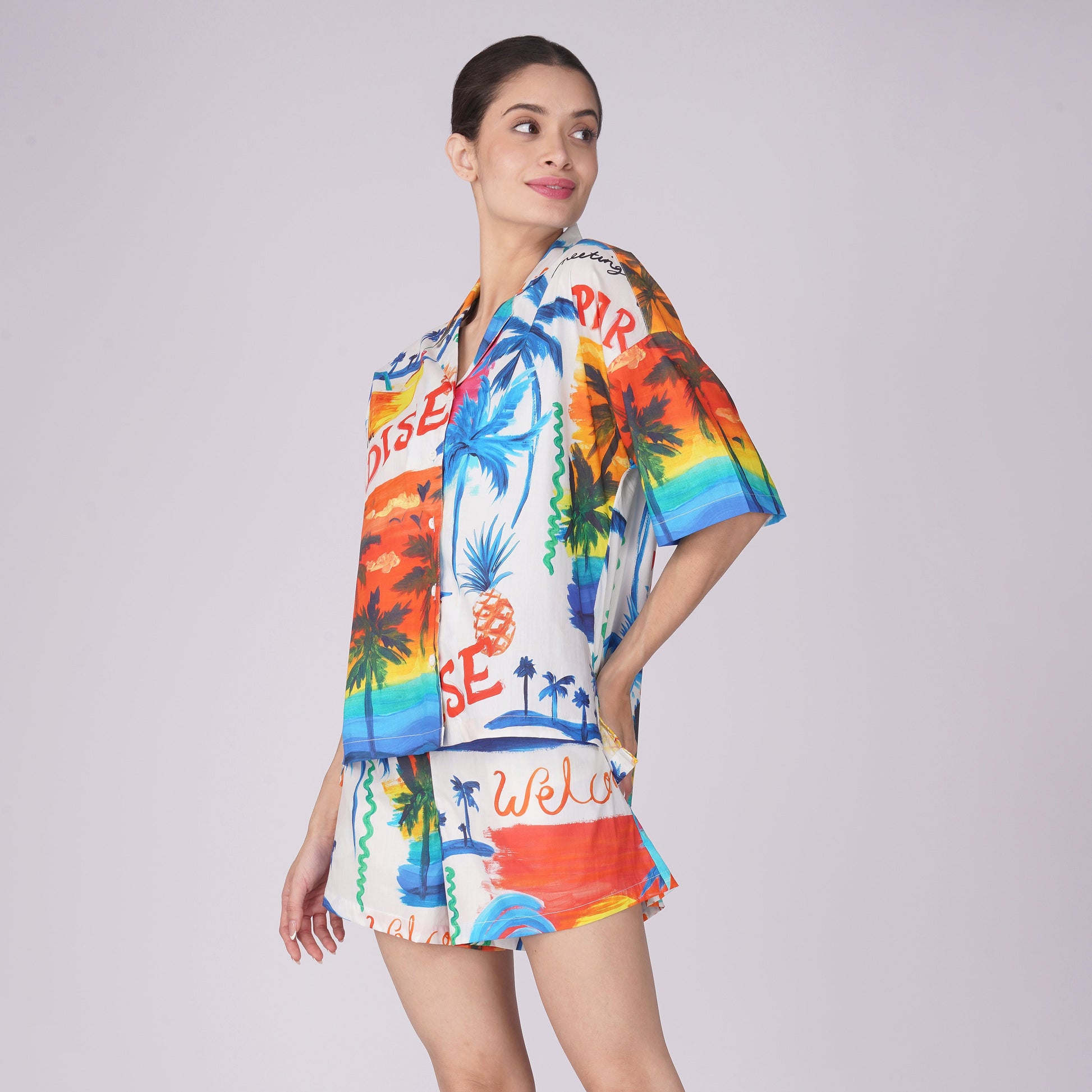 A bold blend of tropical colours, sunset hues, and breezy comfort. Perfect for lounging, vacations, or slow sunny days, this set adds a splash of paradise to your everyday style.