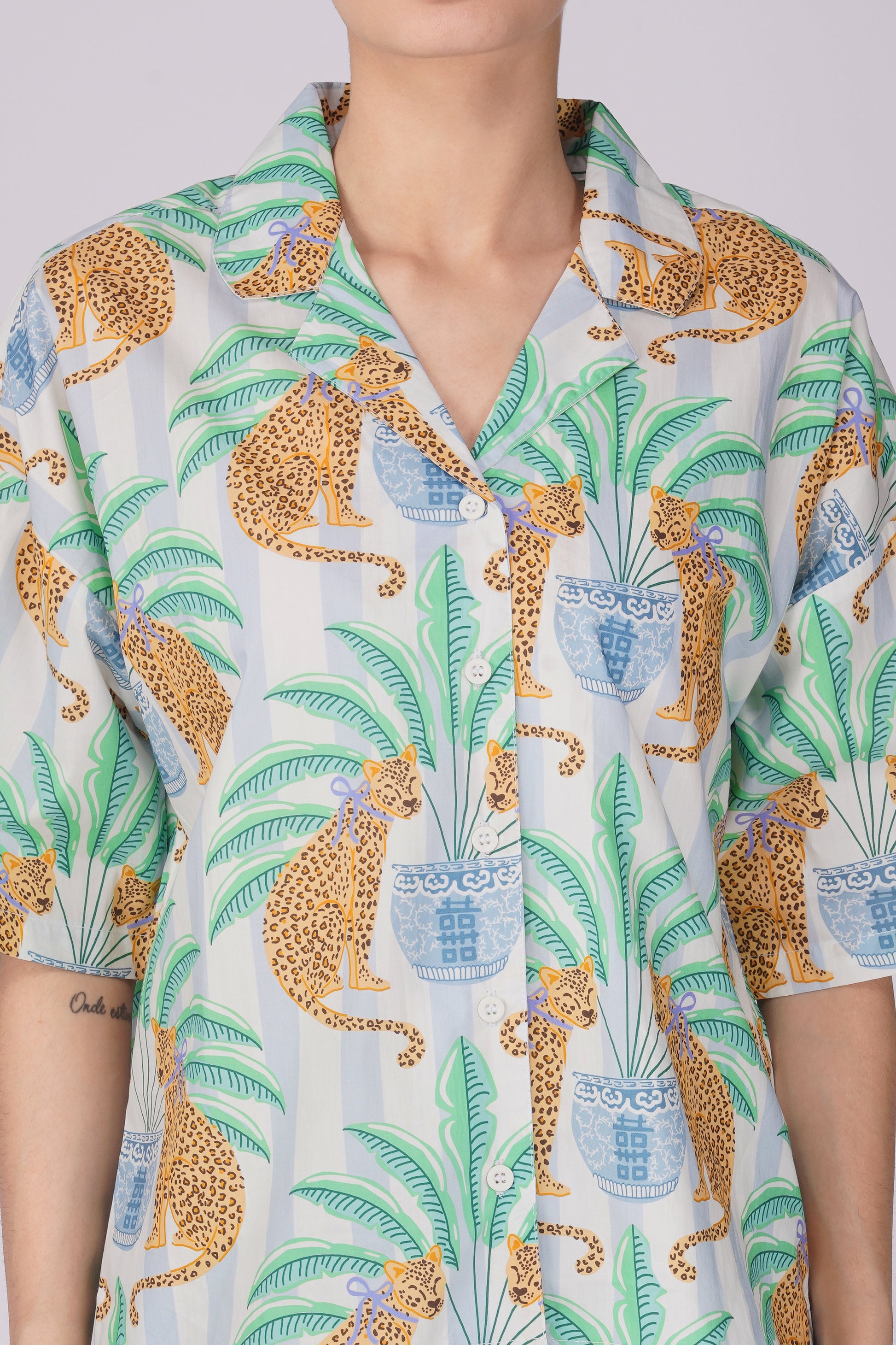 Bring a touch of the wild to your unwind time with our Tropical Leopards Shorts Set.