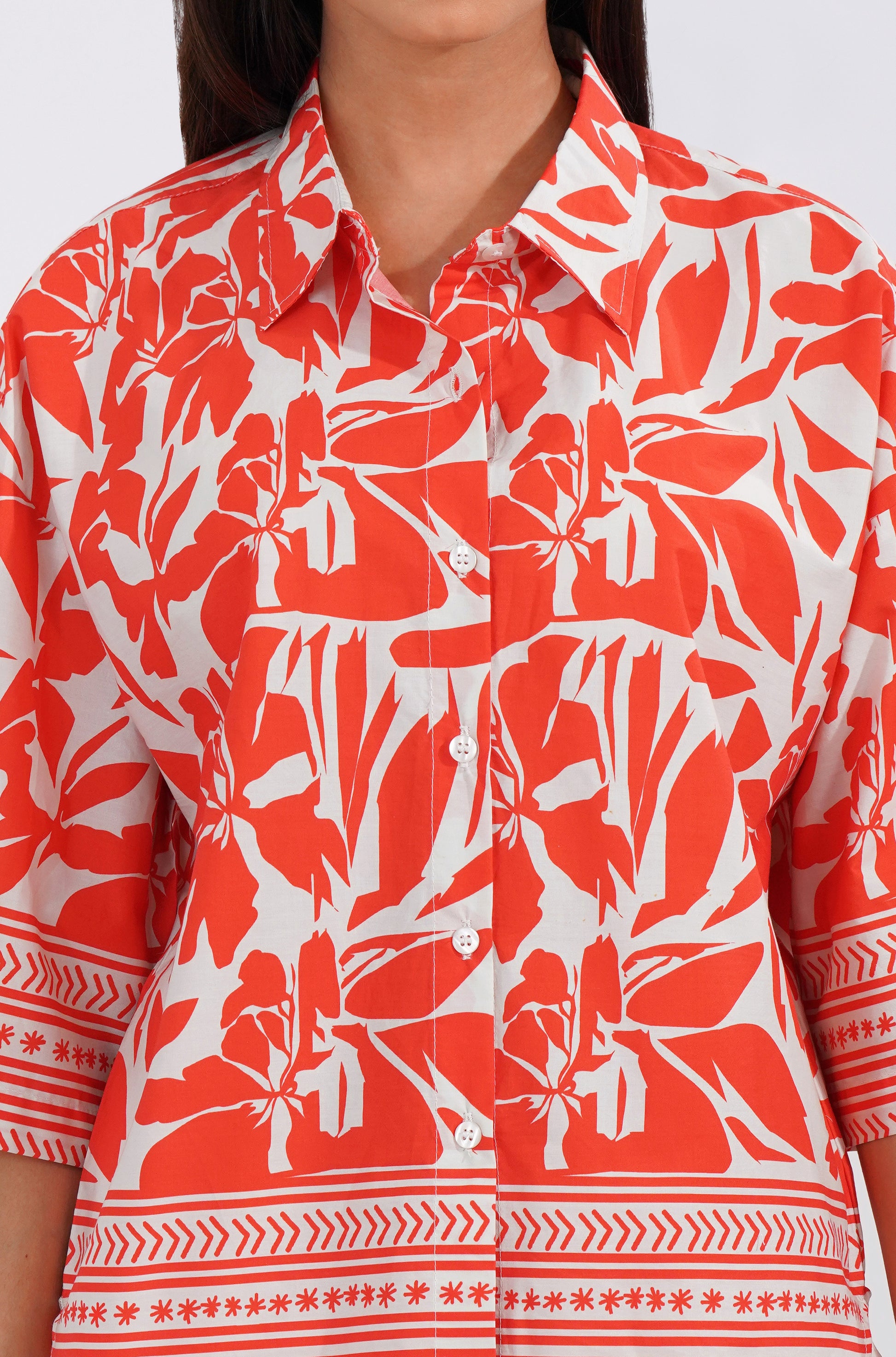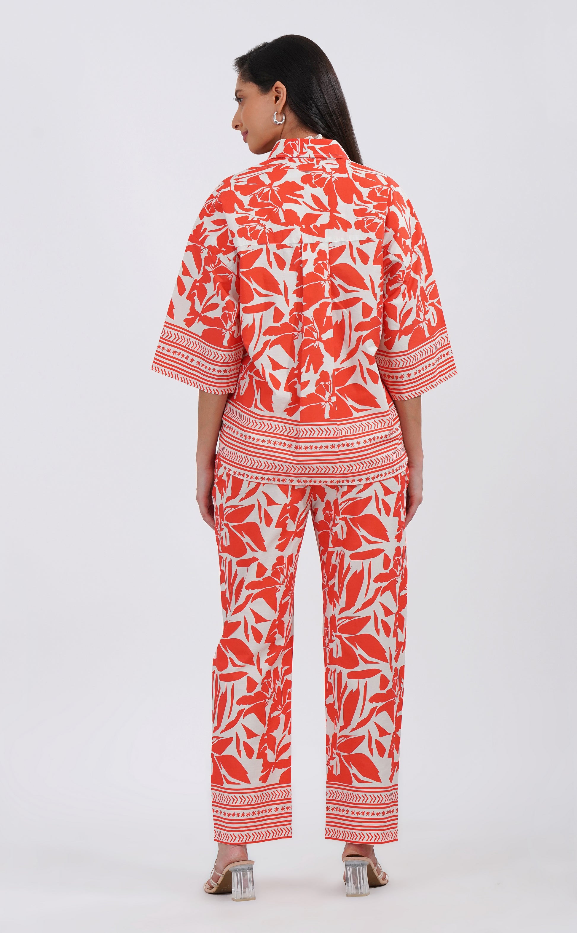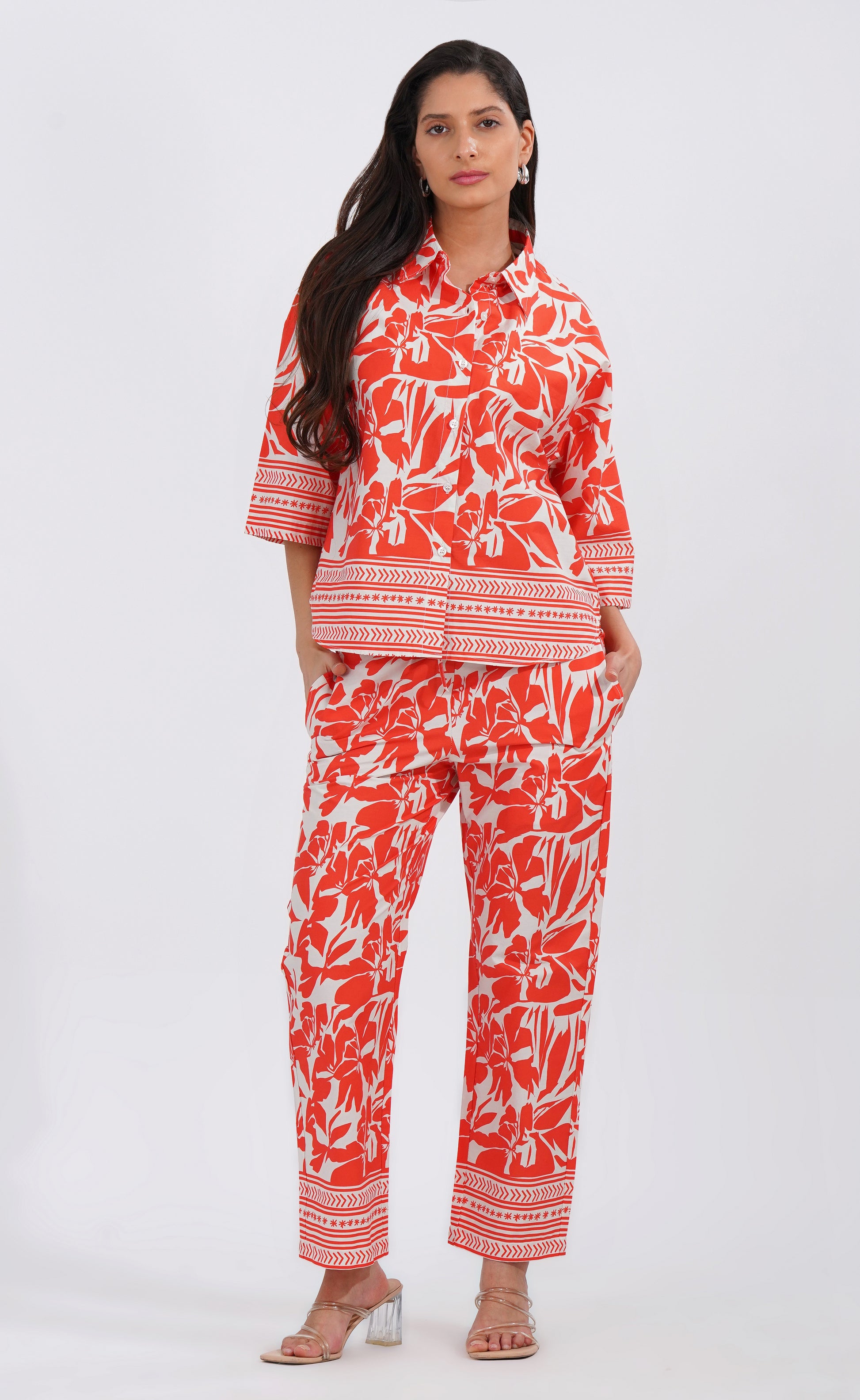 Crafted in 100% breathable cotton, this set features a striking tropical orange floral print with intricate border detailing, making it versatile for brunches, vacations, or laid-back evenings. The relaxed-fit shirt pairs seamlessly with straight-fit pants, giving you a chic, put-together look without compromising on comfort.