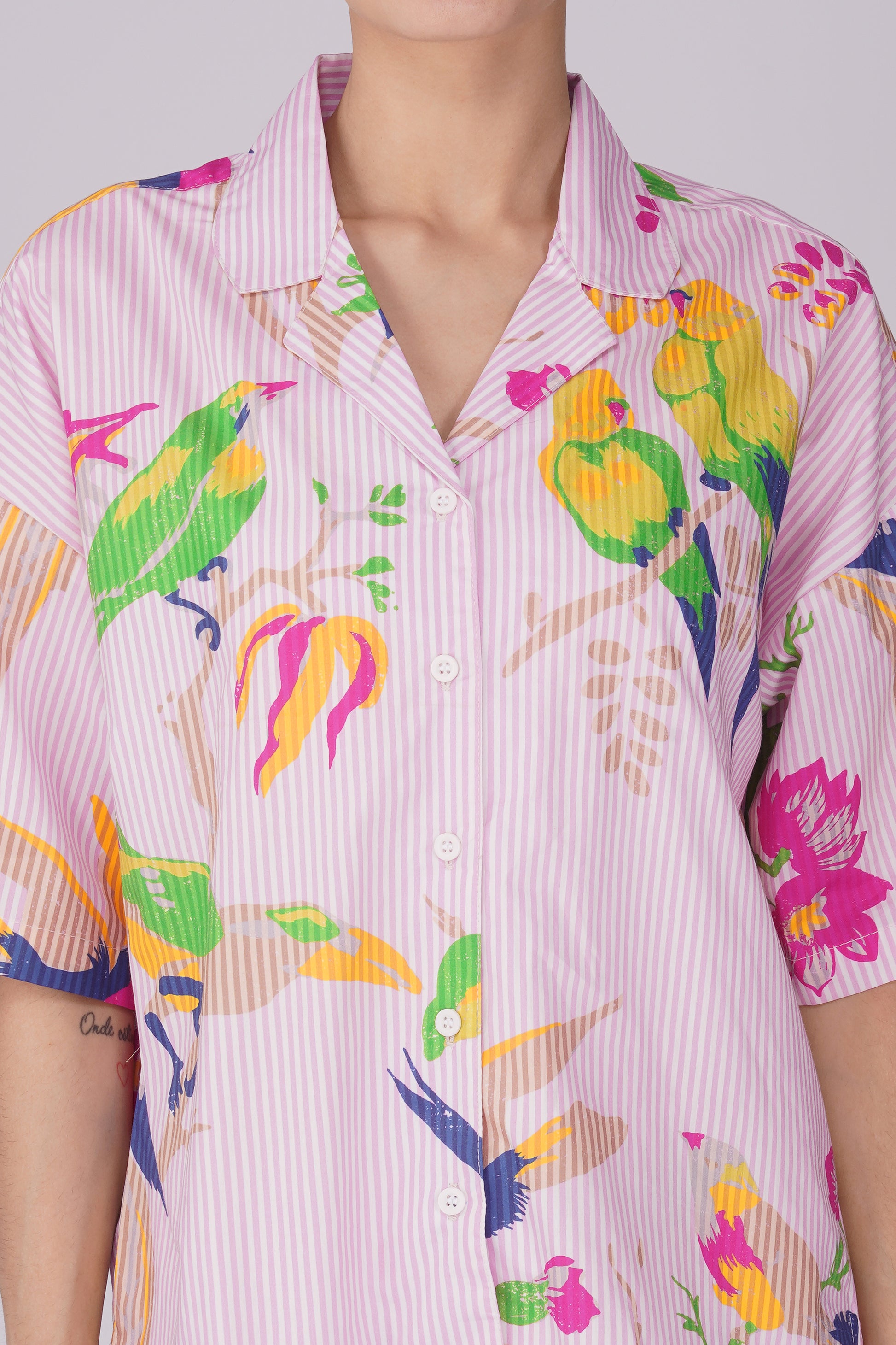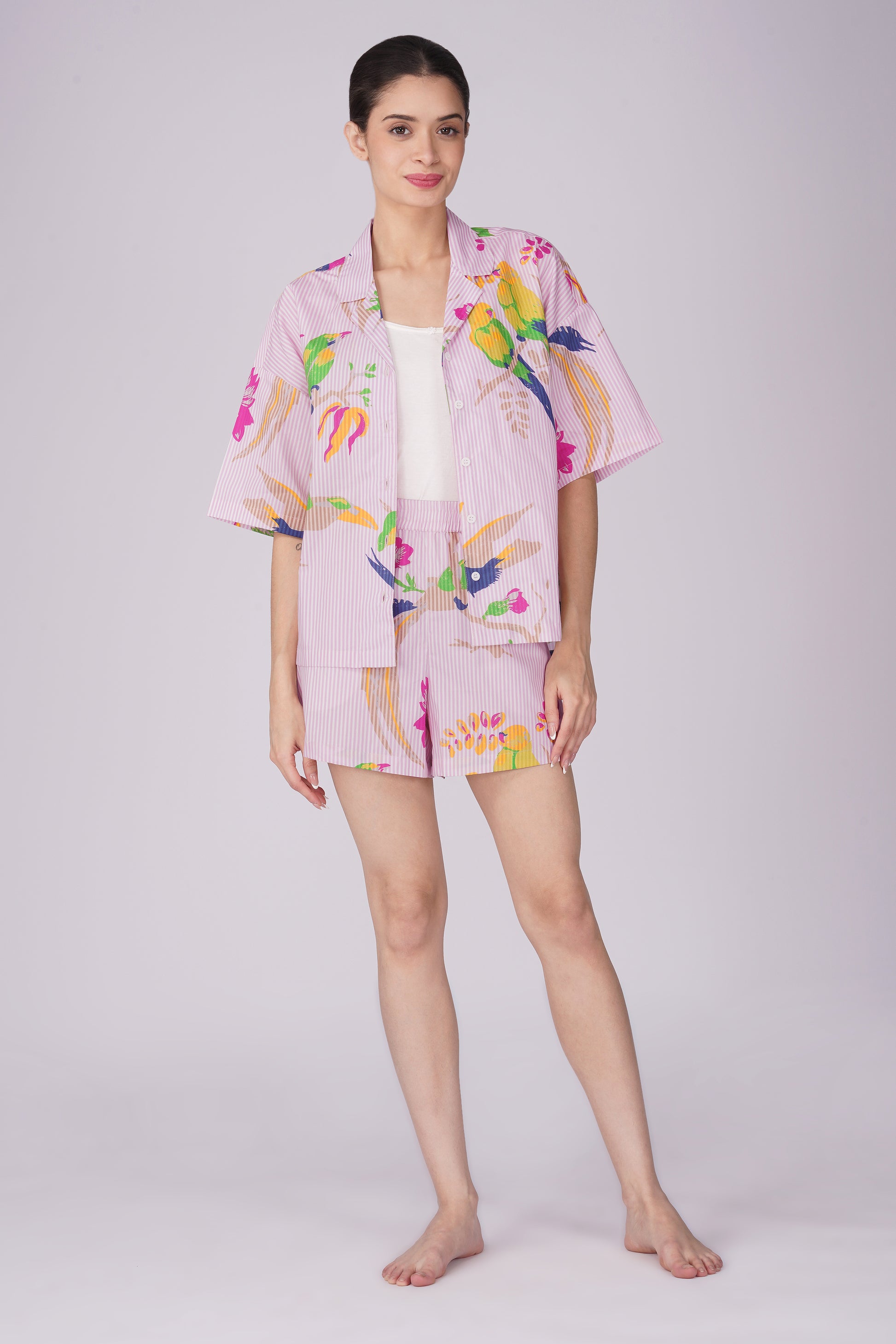 A vibrant blend of tropical birds, playful colours, and breezy comfort. Crafted for easy, all-day lounging, this set brings a burst of paradise to your everyday wardrobe..